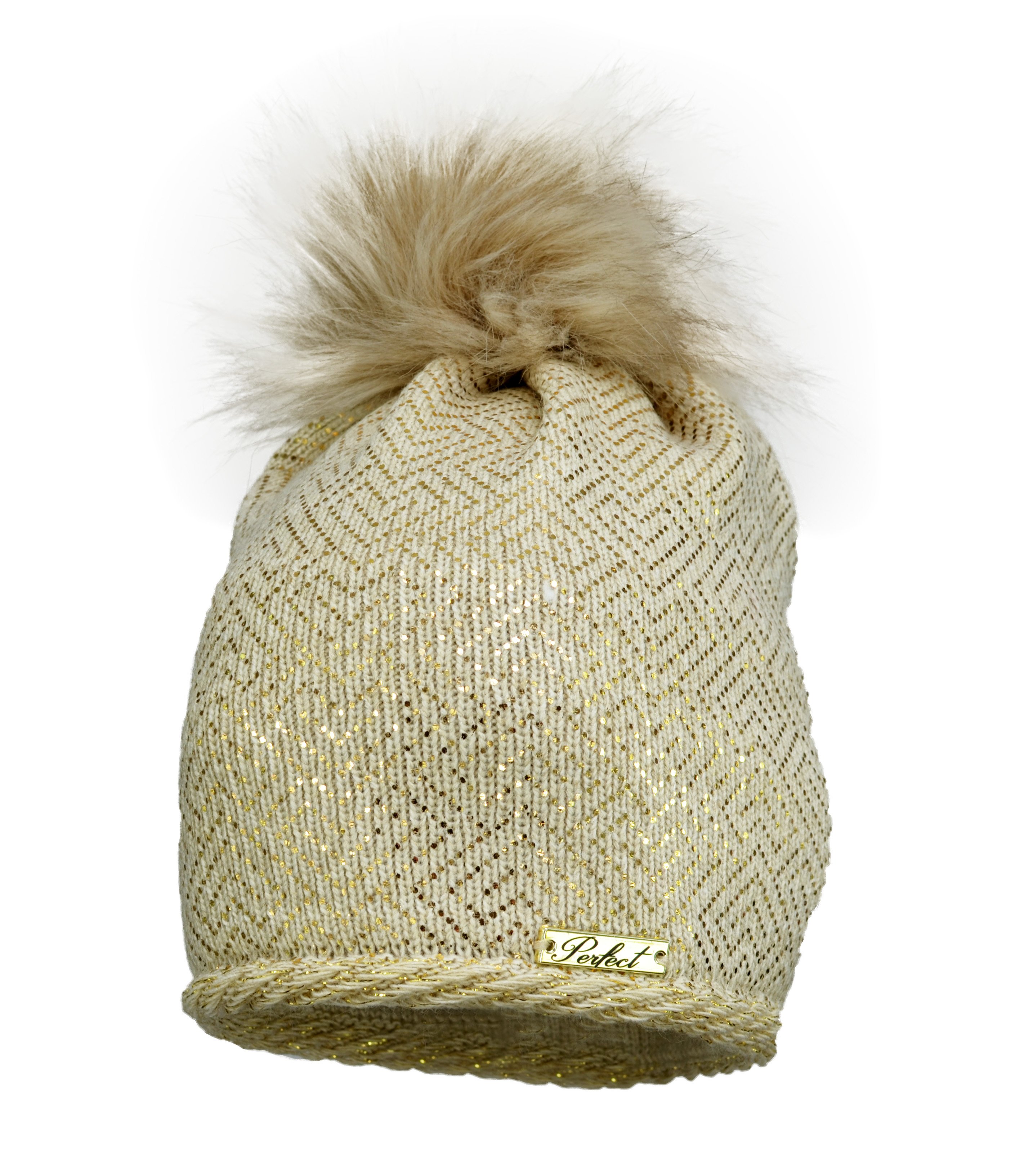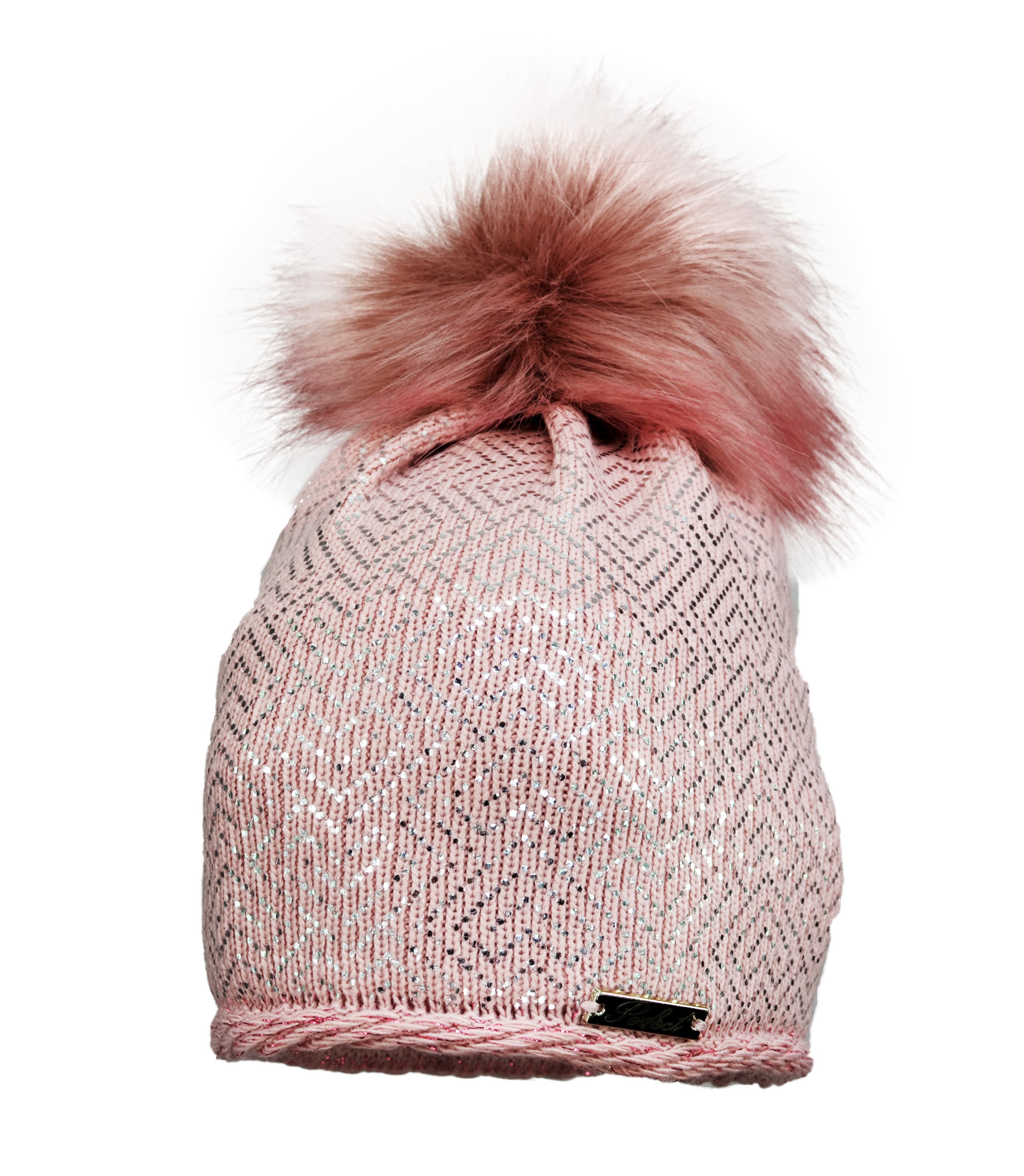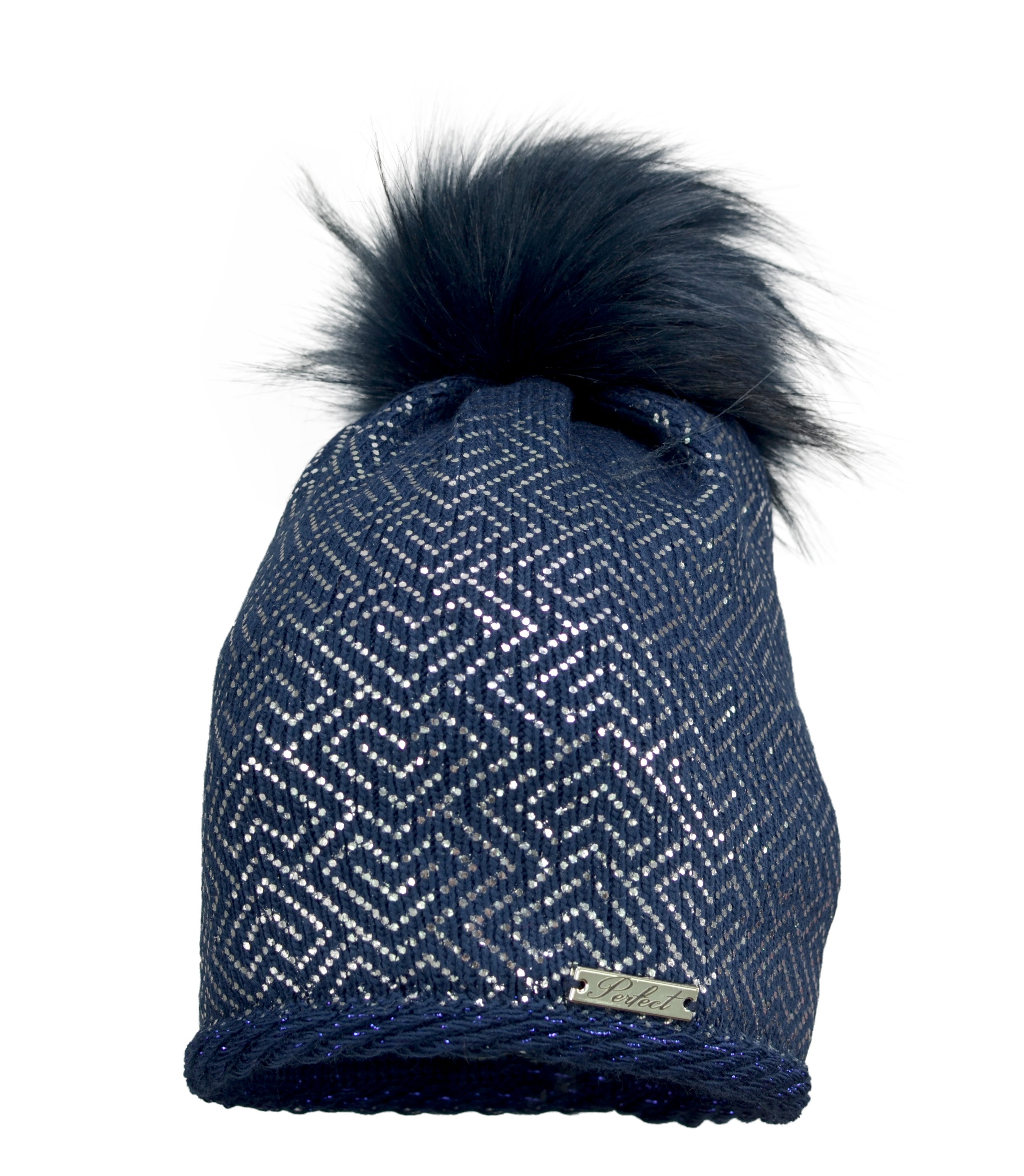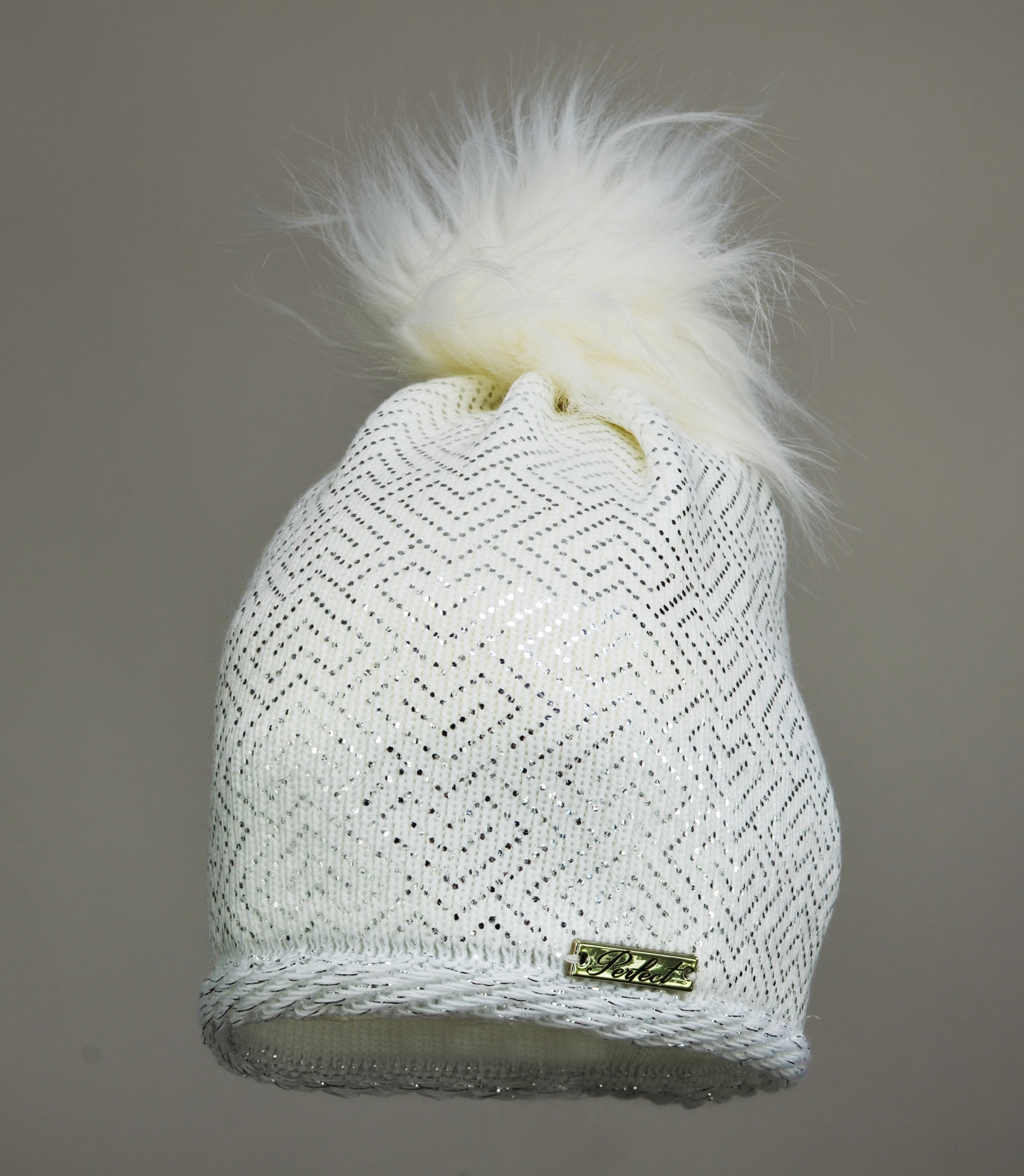 Czapka damska zimowa z pomponem. Ozdobiona stylowym wzorem metalizowanej folii. Wysoka jakość produktu. Wyprodukowano w Polsce.