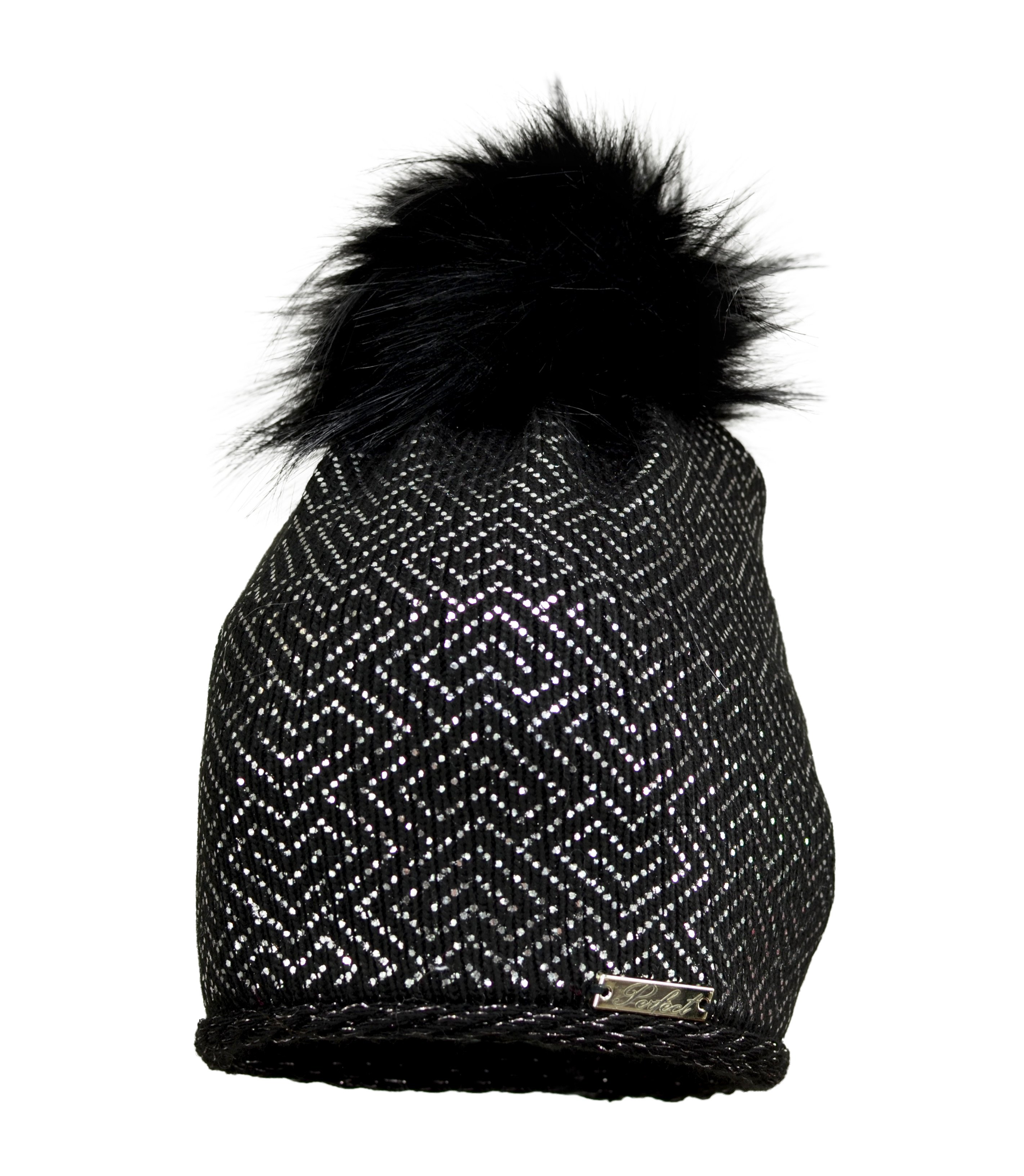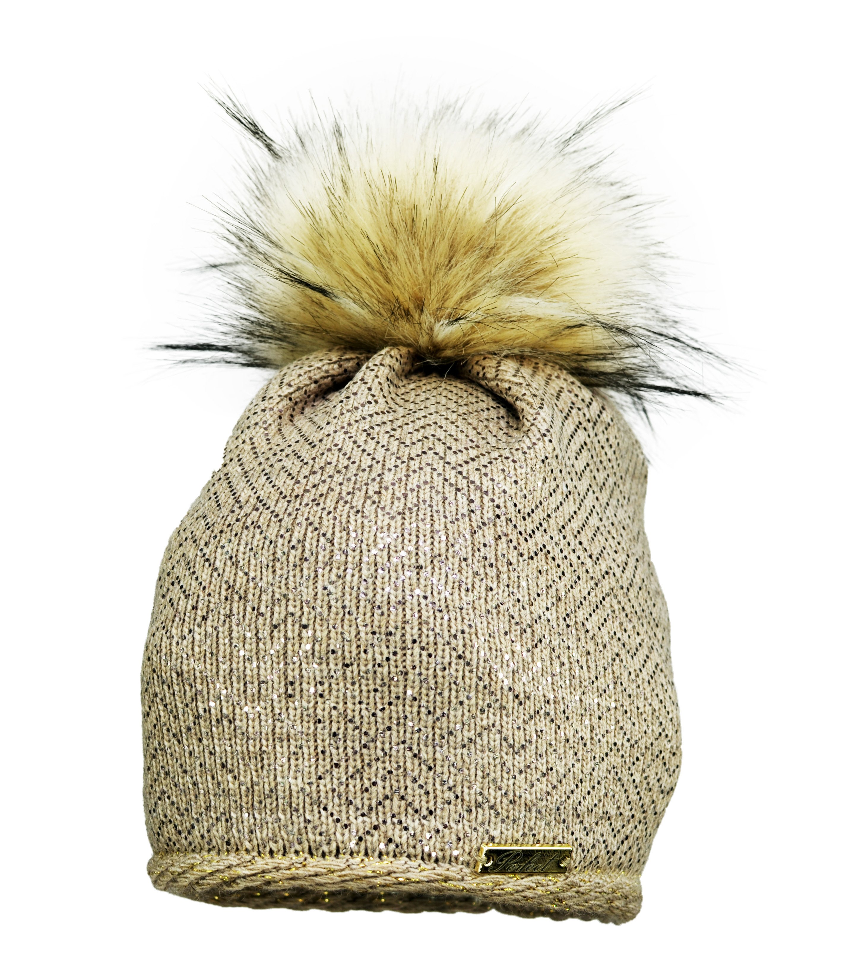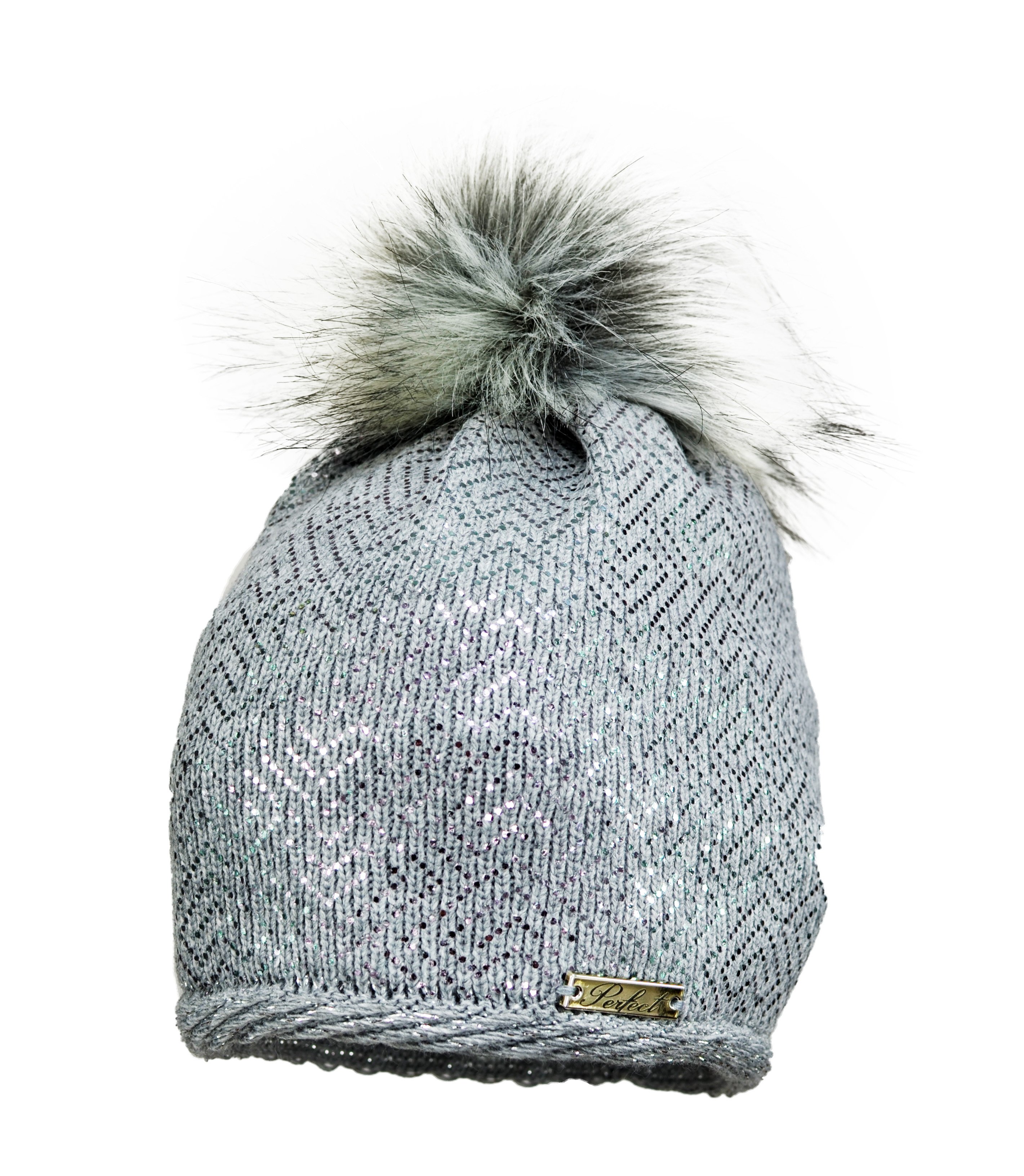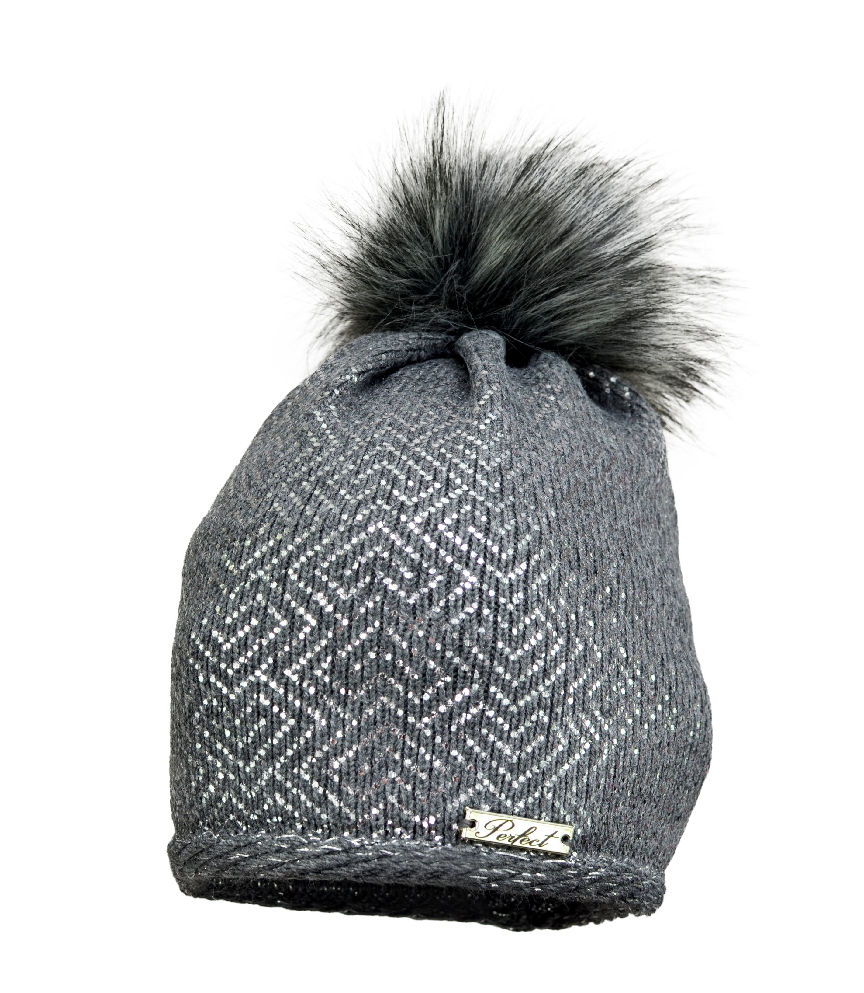 Czapka damska zimowa z pomponem. Ozdobiona stylowym wzorem metalizowanej folii. Wysoka jakość produktu. Wyprodukowano w Polsce.