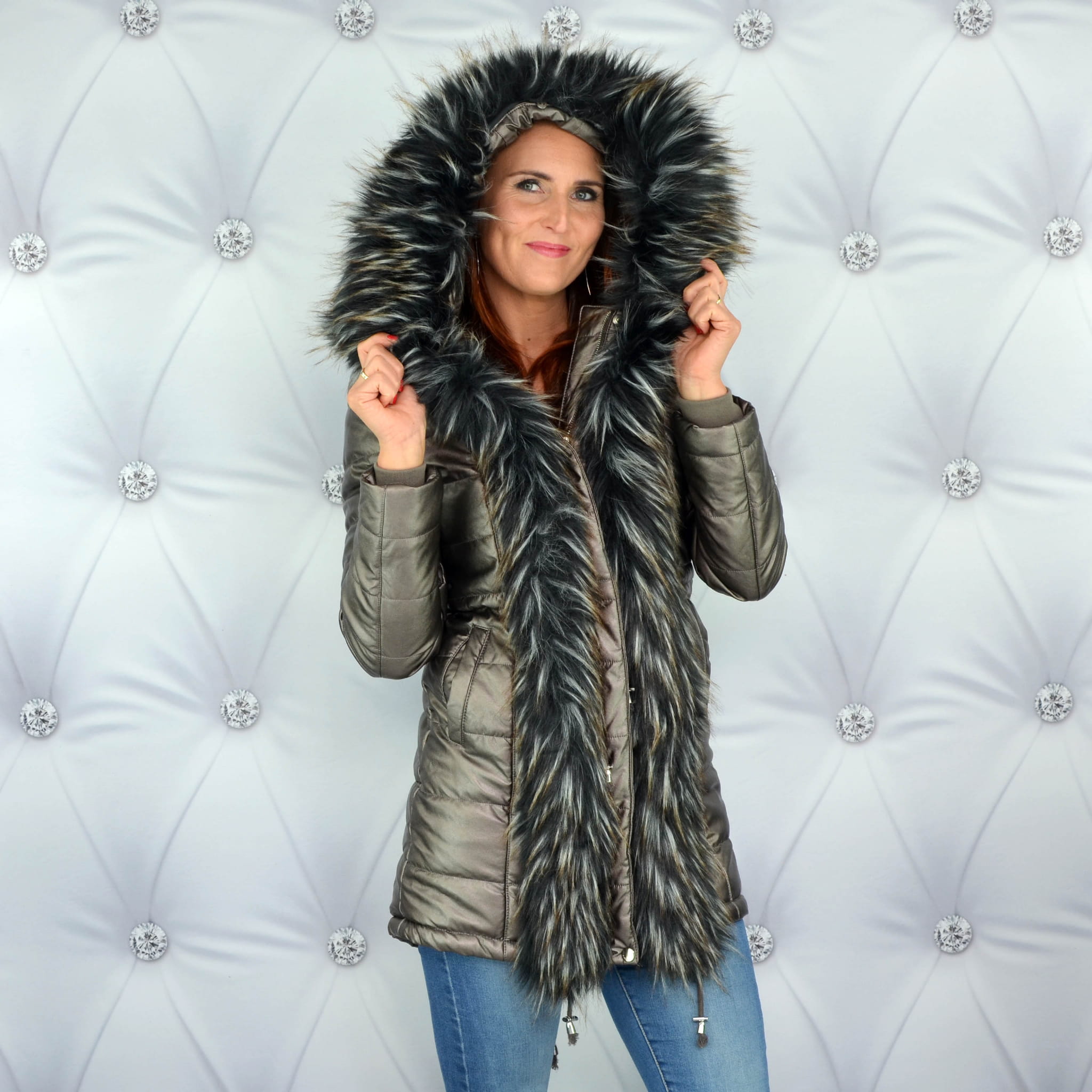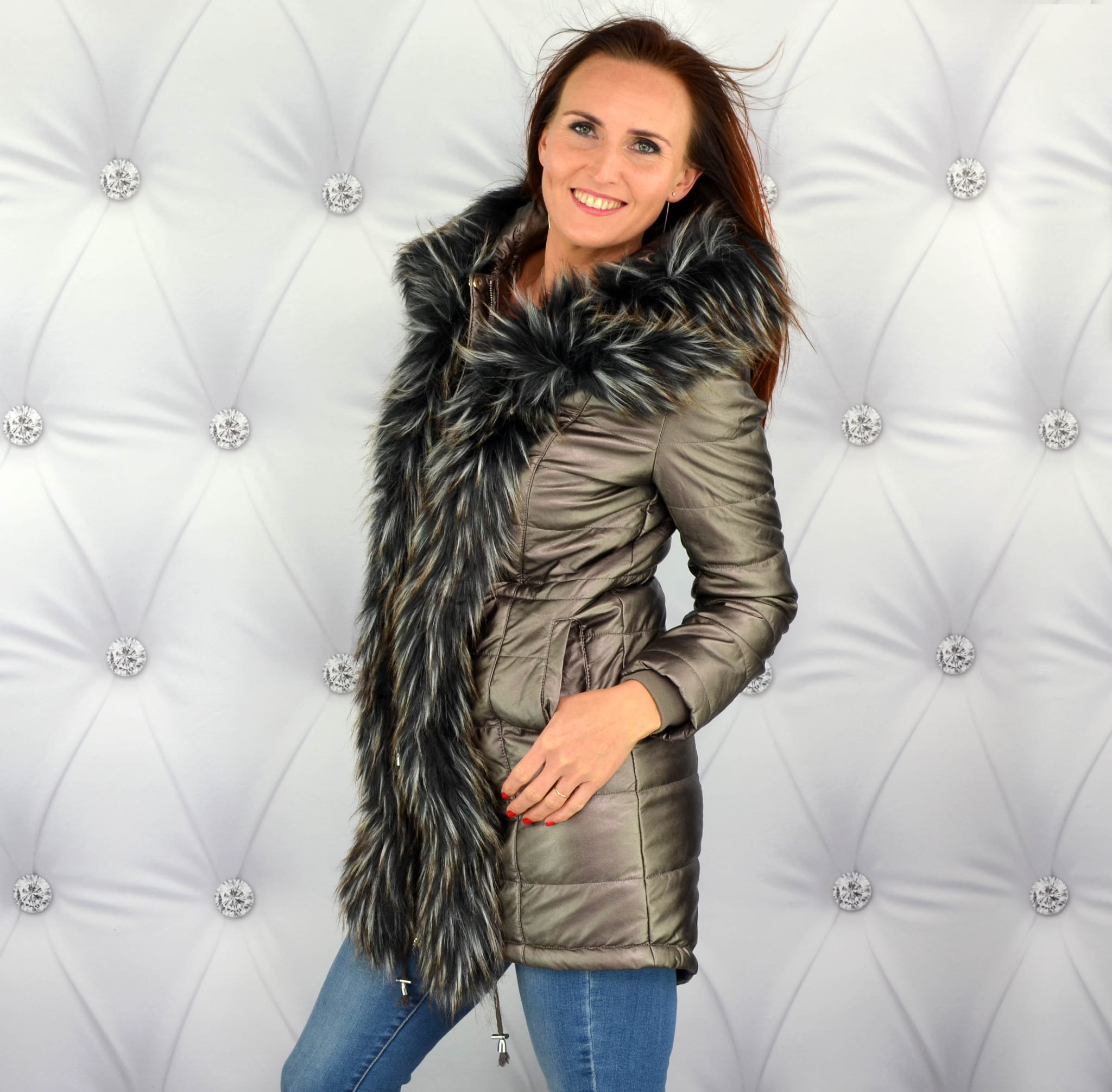 Wyjątkowa, modna kurtka damska z pikowanej ekoskóry z odpinanym futrzanym kołnierzem. Ekologiczne futerko kaptura przypinane jest na metalowe napy. Kurtka zapinana jest na zamek błyskawiczny. Po bokach znajdują się dwie kieszenie. Rękawy zakończone ściągaczami. Dół kurtki ściągany trokami z ozdobnymi zakończeniami. Kolor: ciemny złoty. Wysoka jakość wykonania. Sprzedawana w hurcie pełną rozmiarówką (6 szt. w opakowaniu). Rozmiary od 36 do 46.