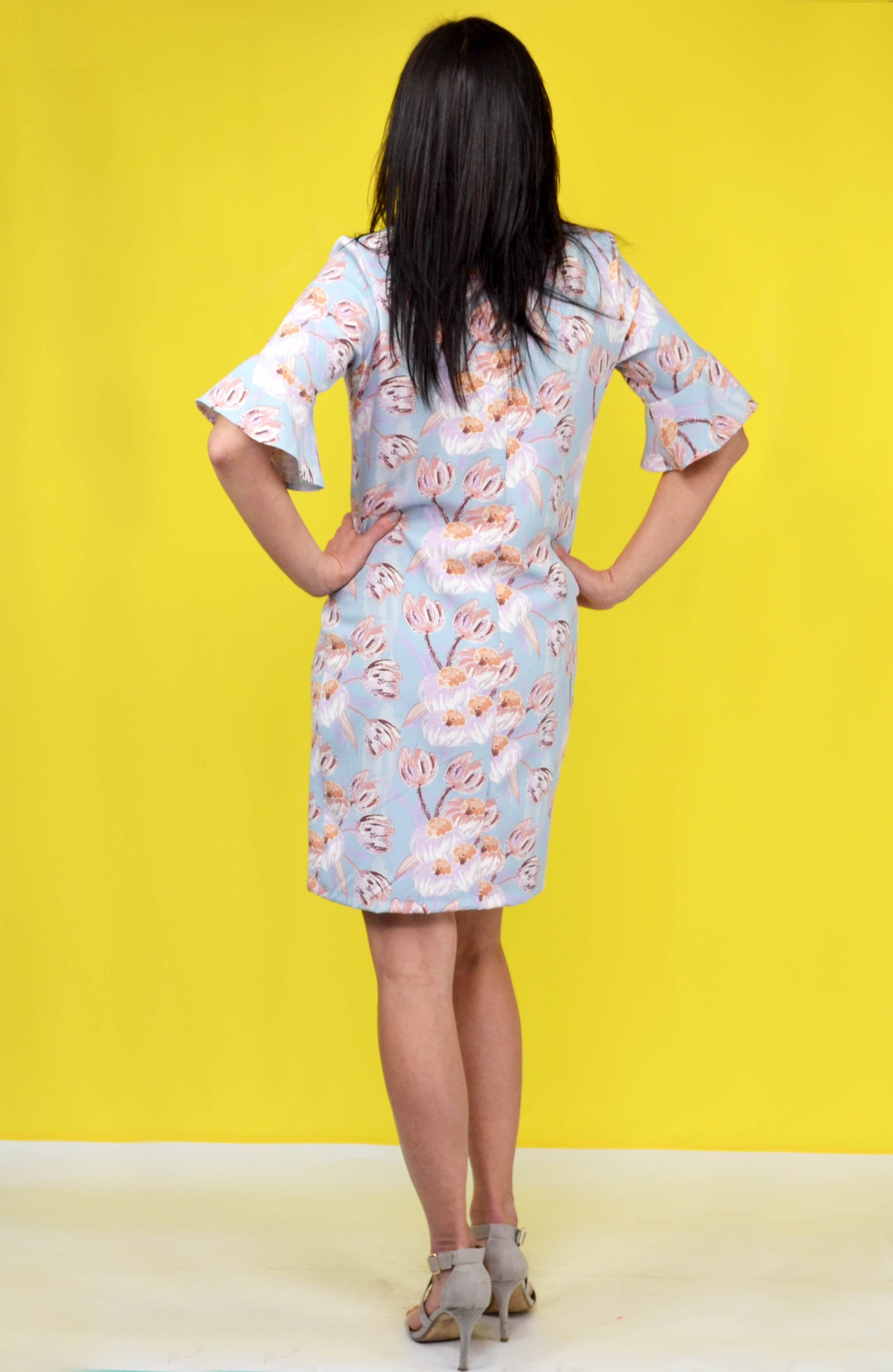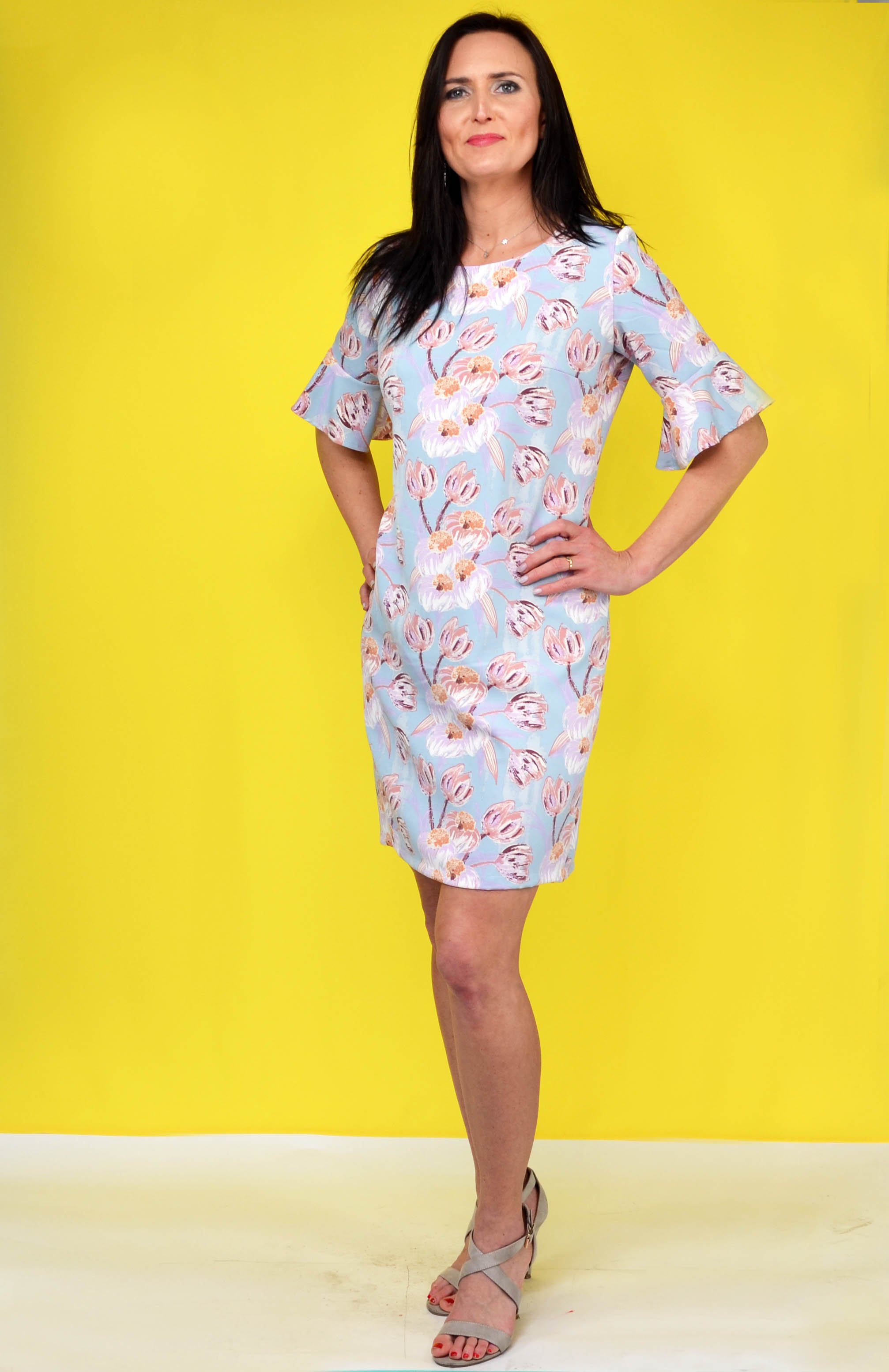 Klasyczna modna sukienka z rękawami ozdobionymi tzw. dzwoneczkami. Wykonana z elastycznej przewiewnej tkaniny typu barbie. Fason taliowany z okrągłym dekoltem i rękawami 3/4. Rozmiary od M do 3XL. Sprzedaż tylko hurtowa. W paczce 5 szt w (rozmiarówka).