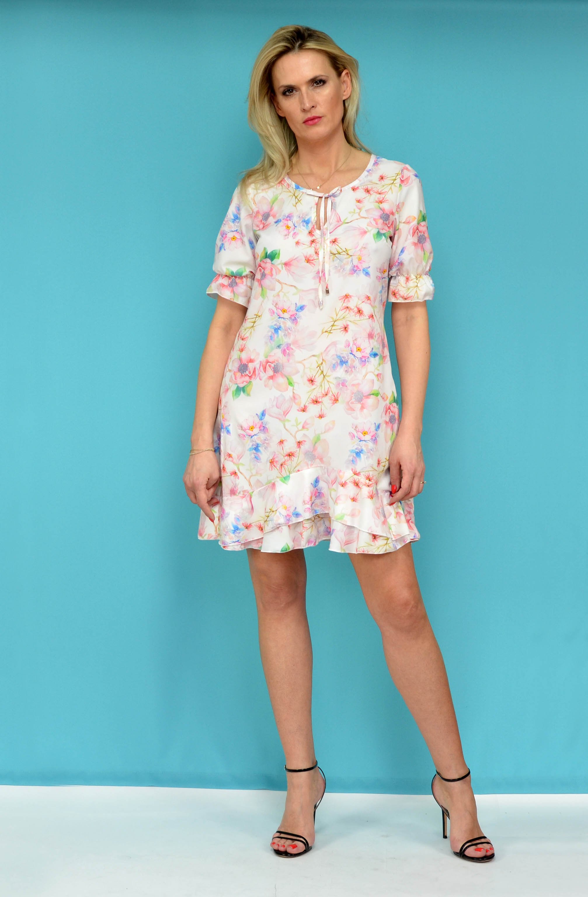 Modna w tym sezonie sukienka z falbanami typu hiszpanka. Fason ma krój trapezowy z delikatnie rozkloszowaną częścią spódnicową. Na dole klosza sukienkę zdobią podwójne falbany. Rękaw jest długości przed łokieć, zdobiony także delikatną falbanką. Dekolt półokrągły z niewielkim rozporkiem typu łezka wiązana na materiałowe troczki. Rozmiary sukienki od M do 3XL (polska rozmiarówka). Materiał ozdobiony jest modnym w tym sezonie motywem kwiecistej łączki na tle w kolorze ecru. Wysoka jakość wykonania w materiale typu silka. Sukienki sprzedawane są tylko w hurcie pełną rozmiarówką, tzn. 5 szt. Produkcja LEMA.